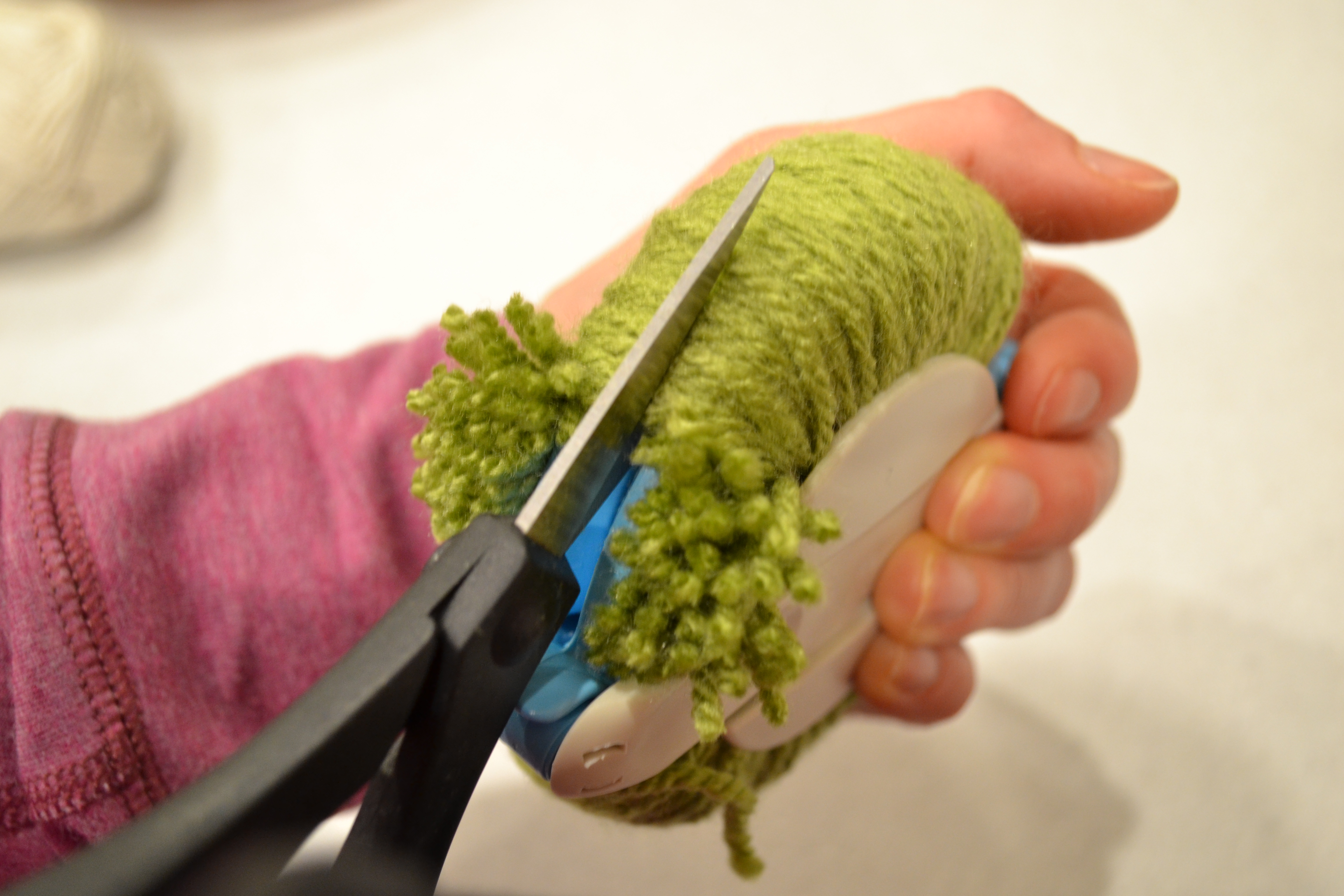I used the blue ‘large’ pom pom maker. They are incredibly easy to use. Just open them out and wind the wool evenly around the arc. Then close them up and while holding it together cut within the groves as shown.