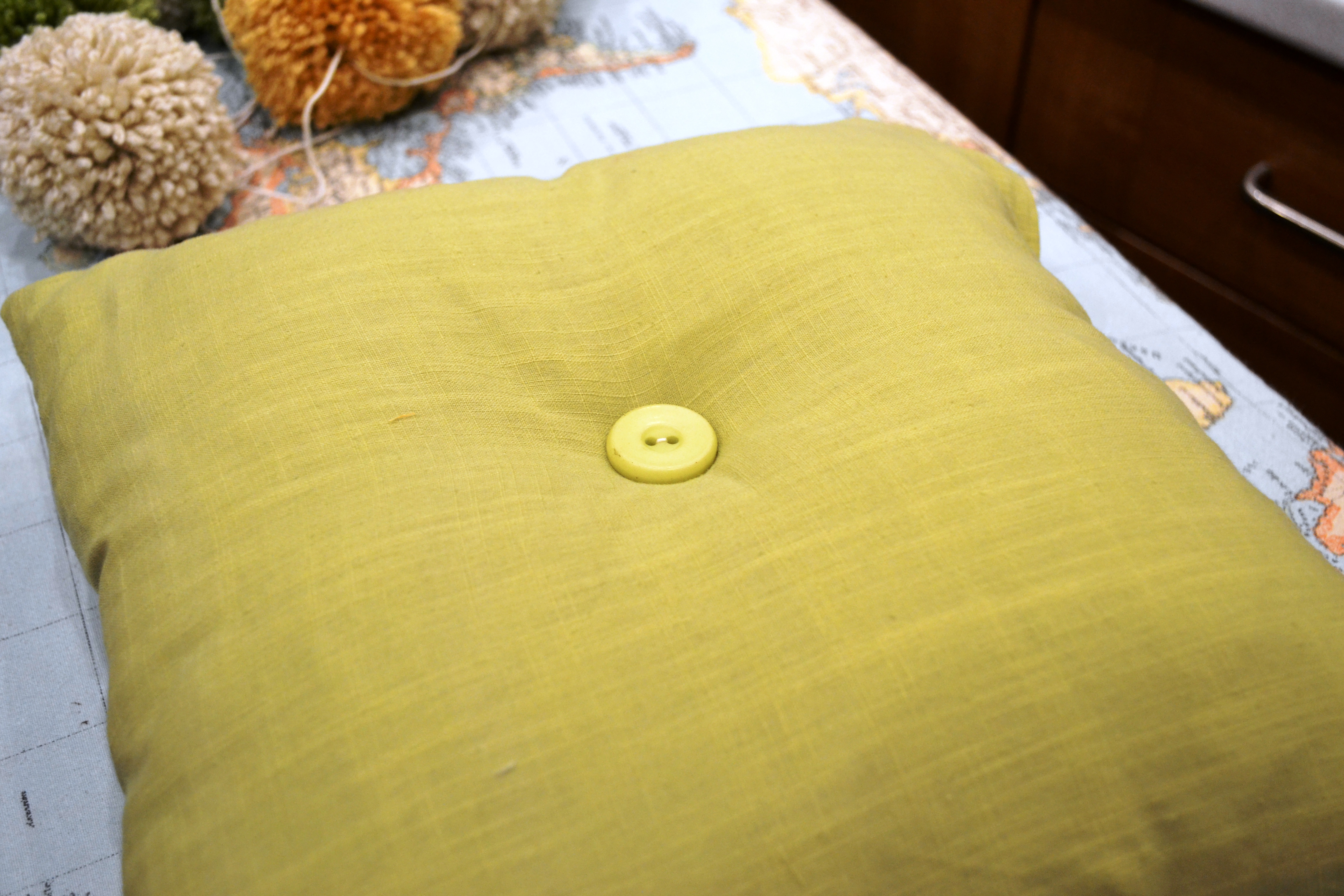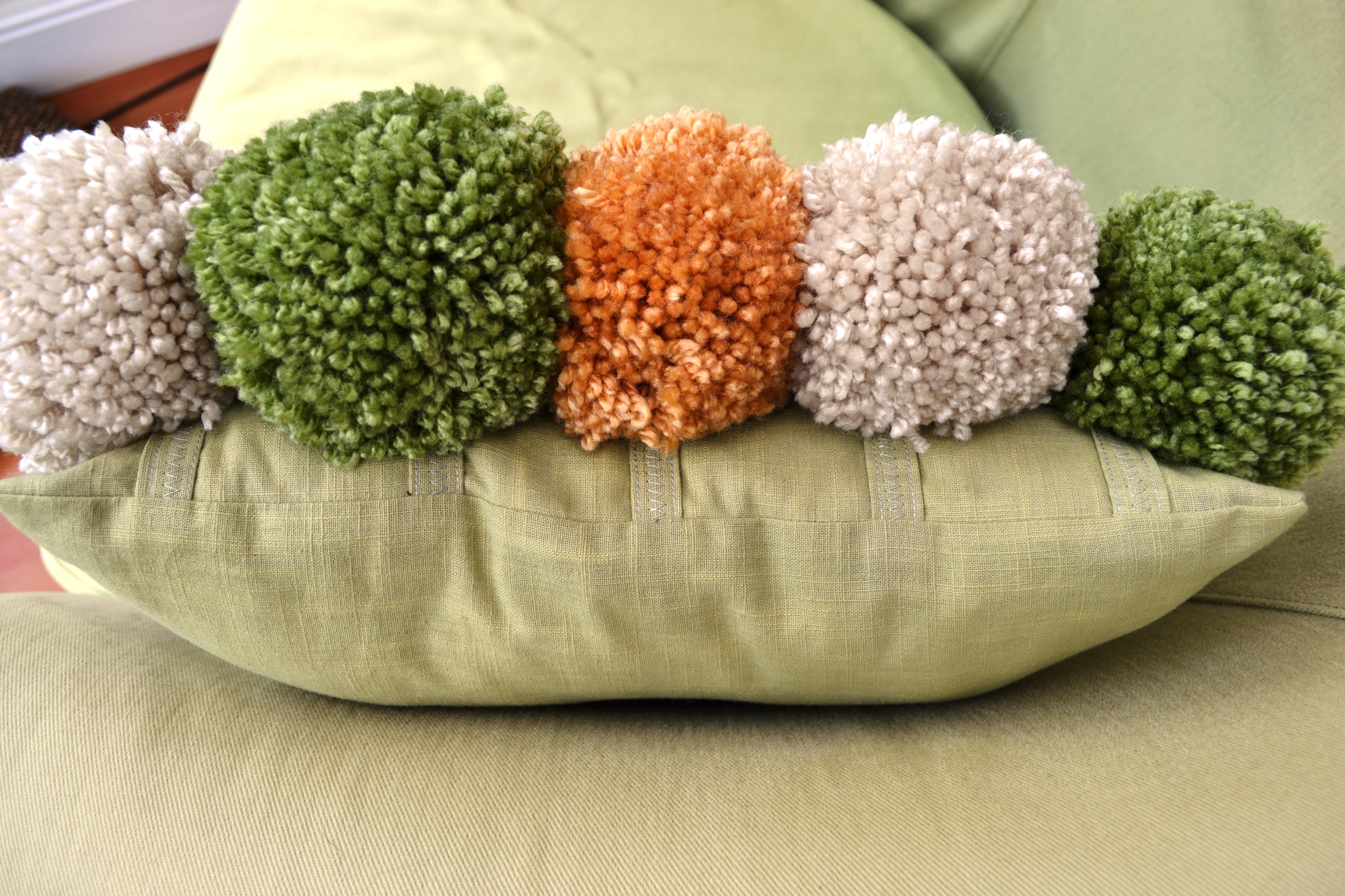 Then all you have to do is tightly tie the pom poms onto the cushion, pulling the string and knotting it really tightly before cutting off the ends.