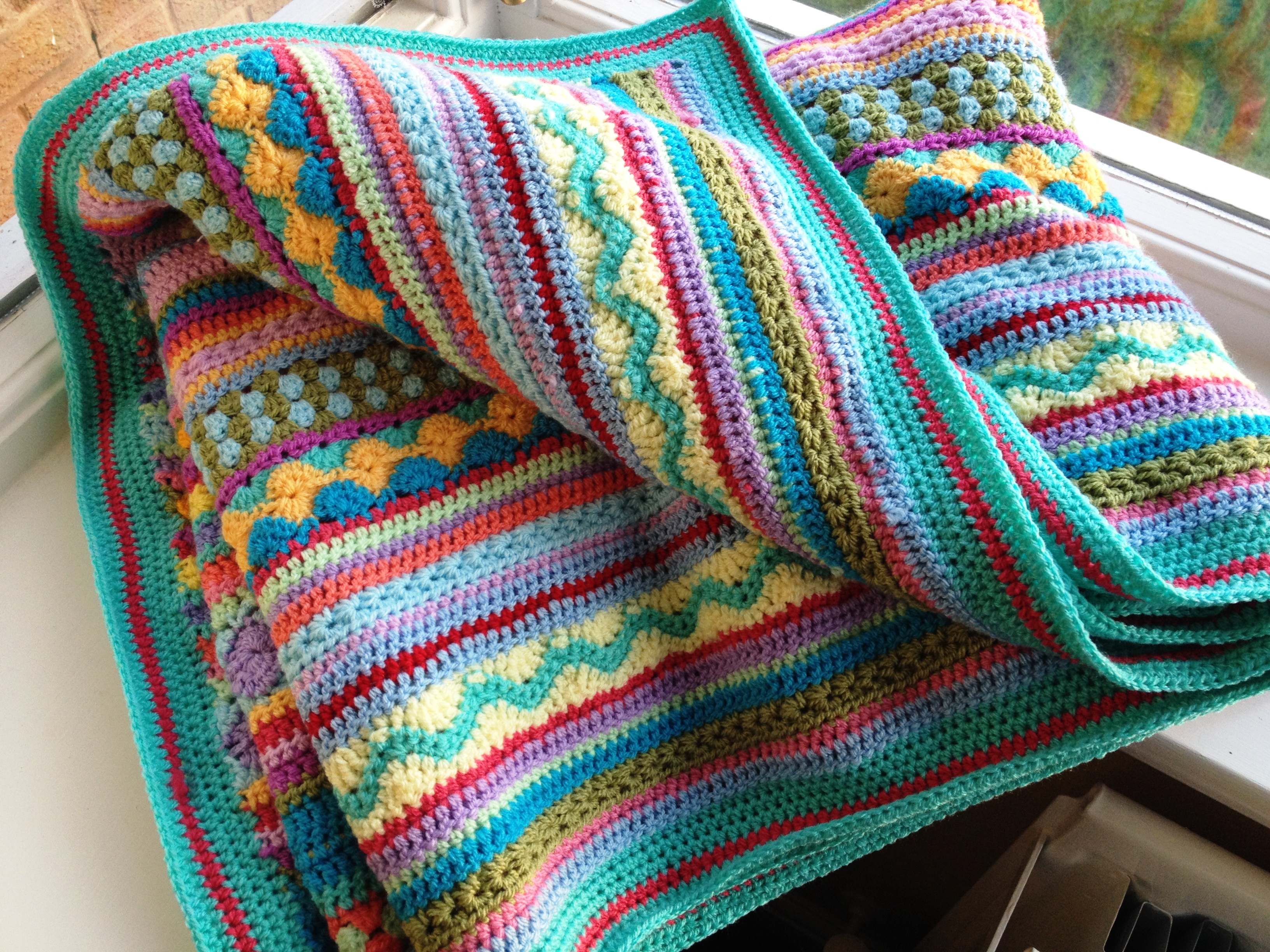 Beautiful colours, I love all the different stitches, it makes it a very special blanket. The edging just finishes everything off lovely 🙂