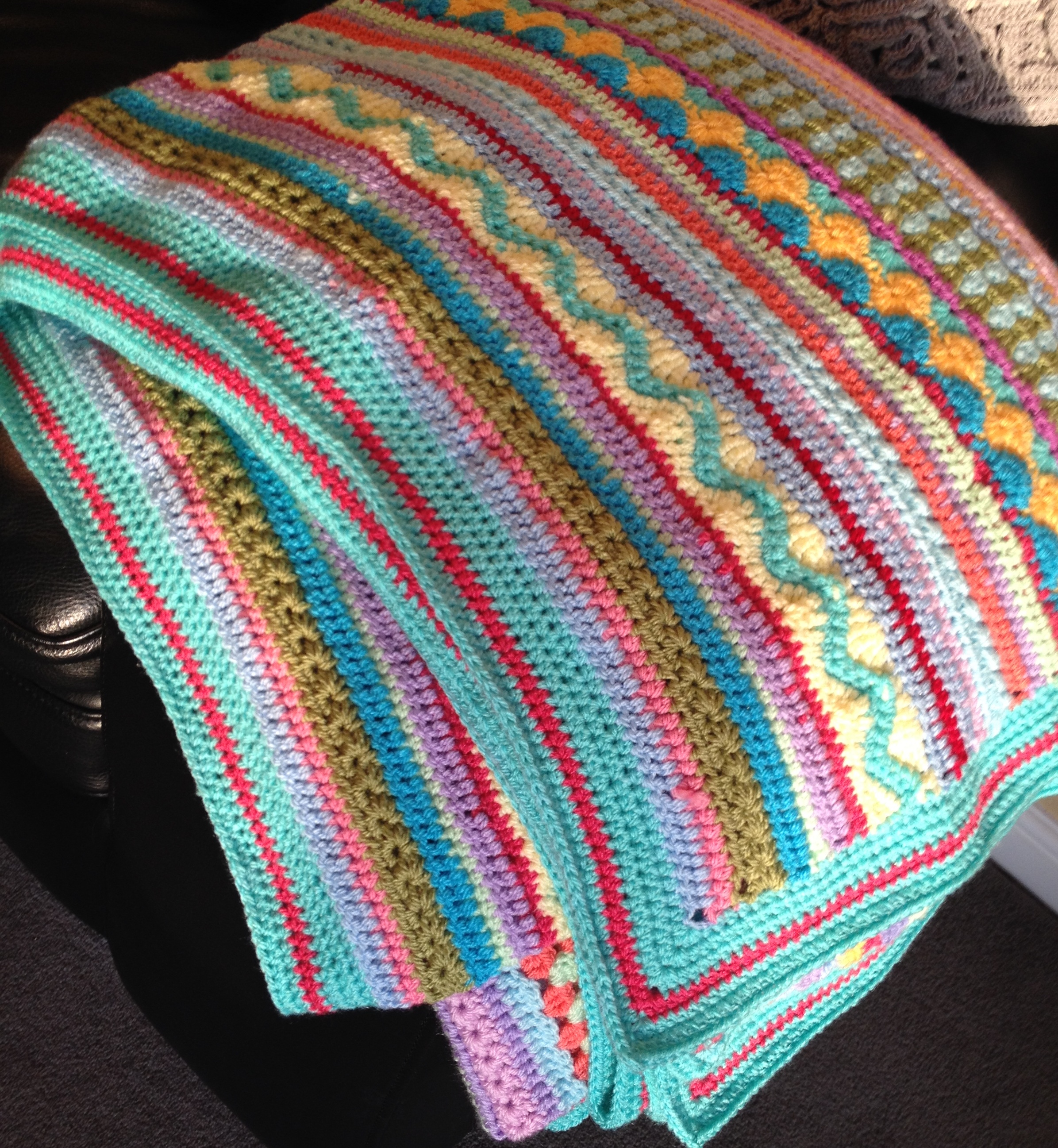 Such a cheerful outcome! love the idea of the CAL project. Great way to practise different stitches and patterns too. It looks great with the border and everyone should have a snuggle blanket for a chair 😉