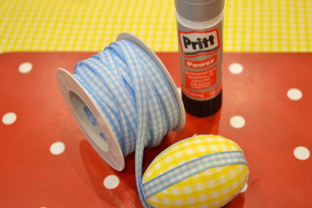 After I had covered all the eggs I finished them off by covering the grooves with some thin ribbon, using a ‘prit stick’ along the grooves to stick the ribbon fast.