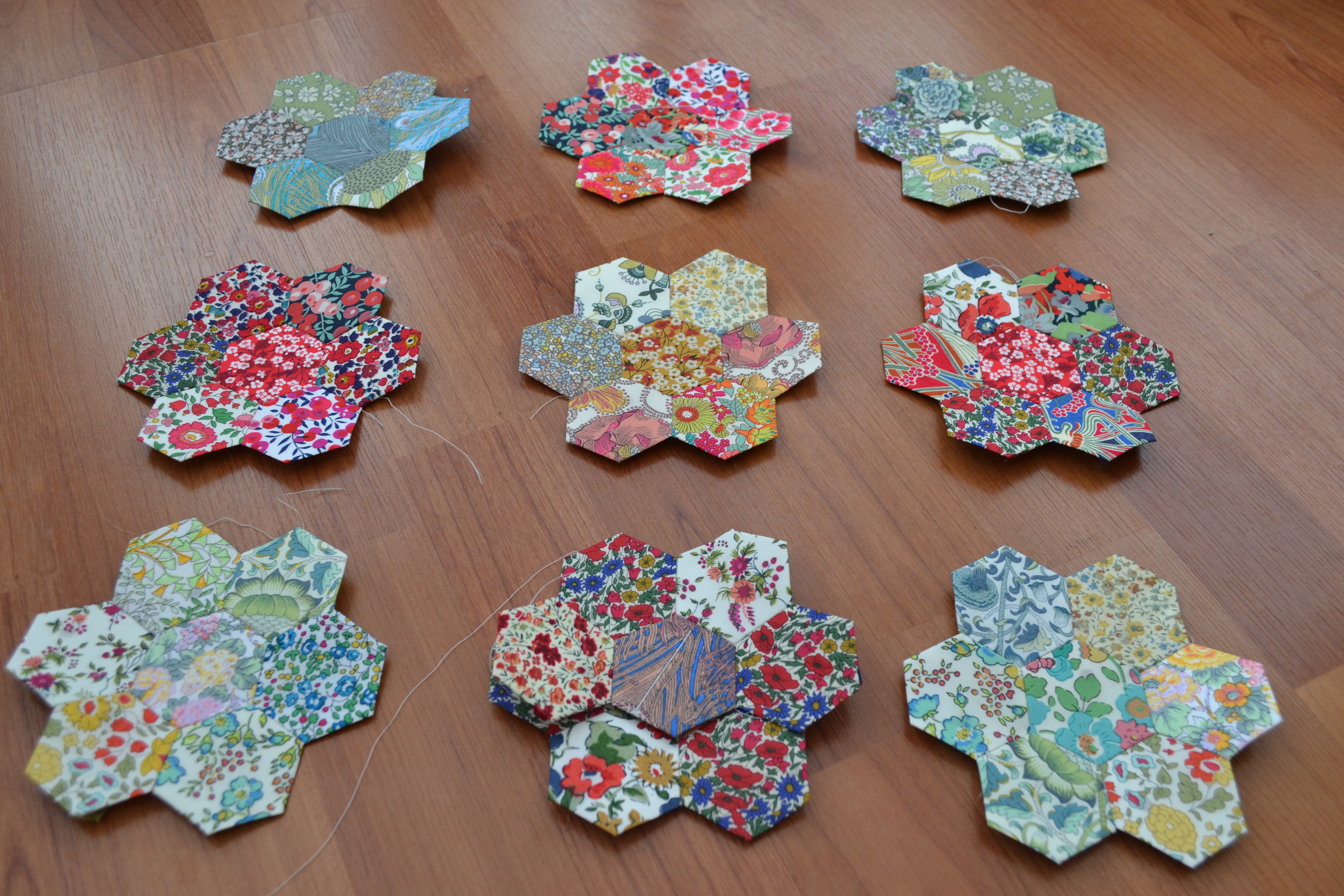 I’ve collected my liberty hexies into some sort of colour theme and sewn the flowers together.
