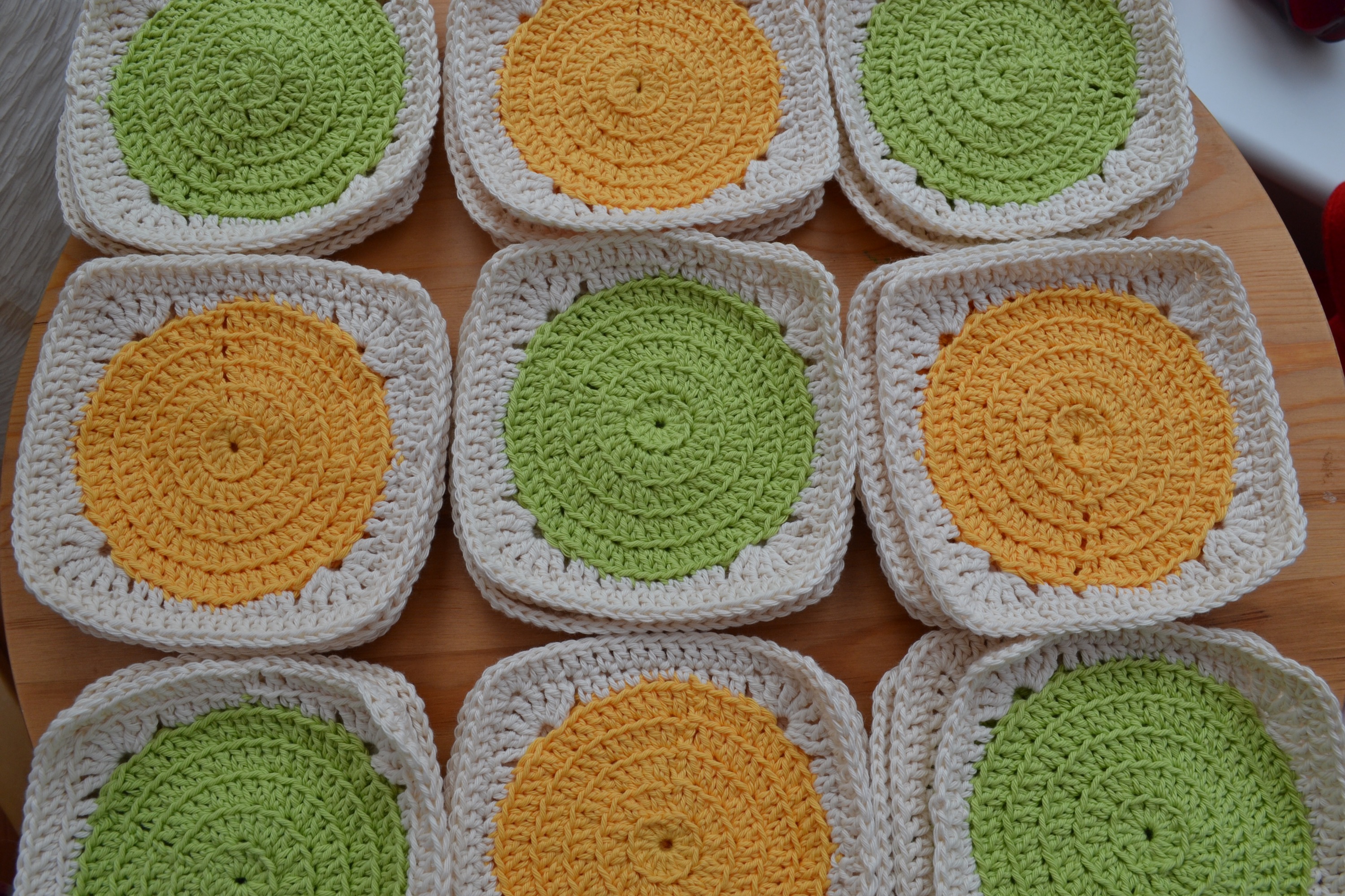 From Minerva’s website I chose Stylecraft’s Classique cotton dk in Ivory, Soft Lime and Sunflower. I used 2 balls of each and a 4mm crochet hook.
