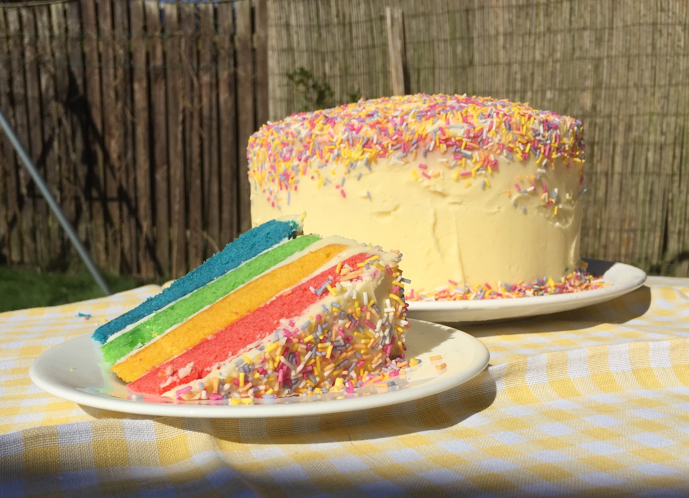 She used a tiny amount of gel colouring in each layer, hence the vivid colours. She is her own harshest critic and claimed it a little heavier than she was hoping but we didn’t notice!
