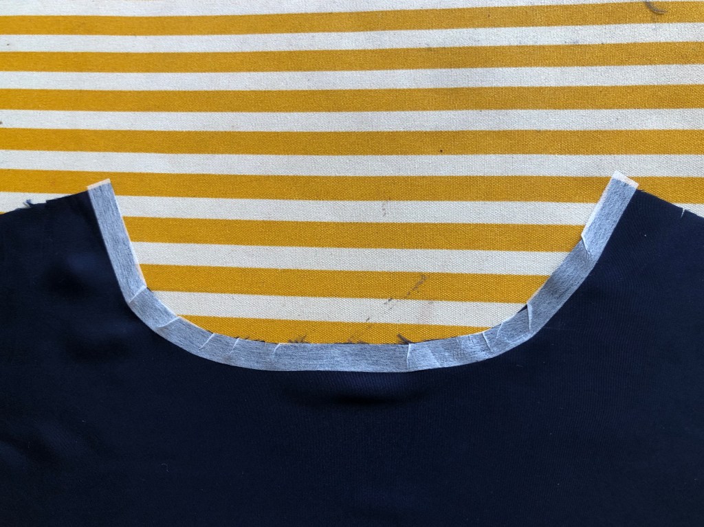 Before I even moved my fabric across the room I stabilised the neck line with iron on stabiliser tape to prevent my neckline stretching out.