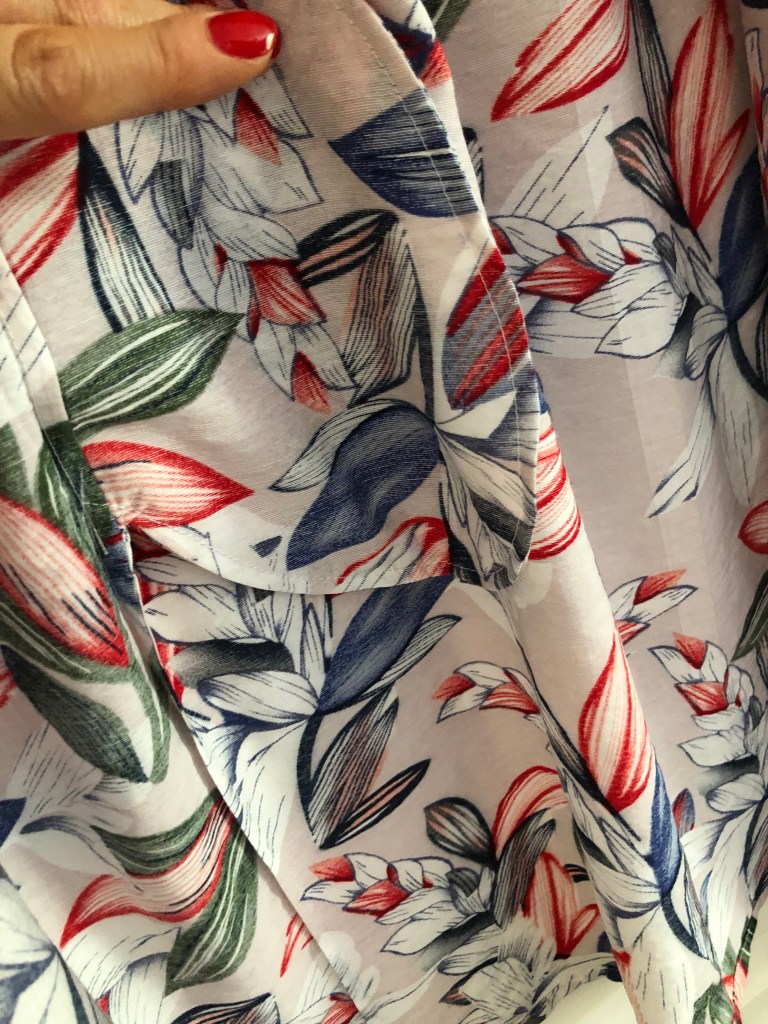 I made it up in a linen-like viscose from Abakhan bought on a visit early in the summer. Unfortunately I can not find it online as I would heartily recommend it. It is very cool and comfortable against my skin. As I get older I am less tolerant of any slightly scratchy fabric on my skin, especially in the short freakishly hot heat waves we’ve been having.