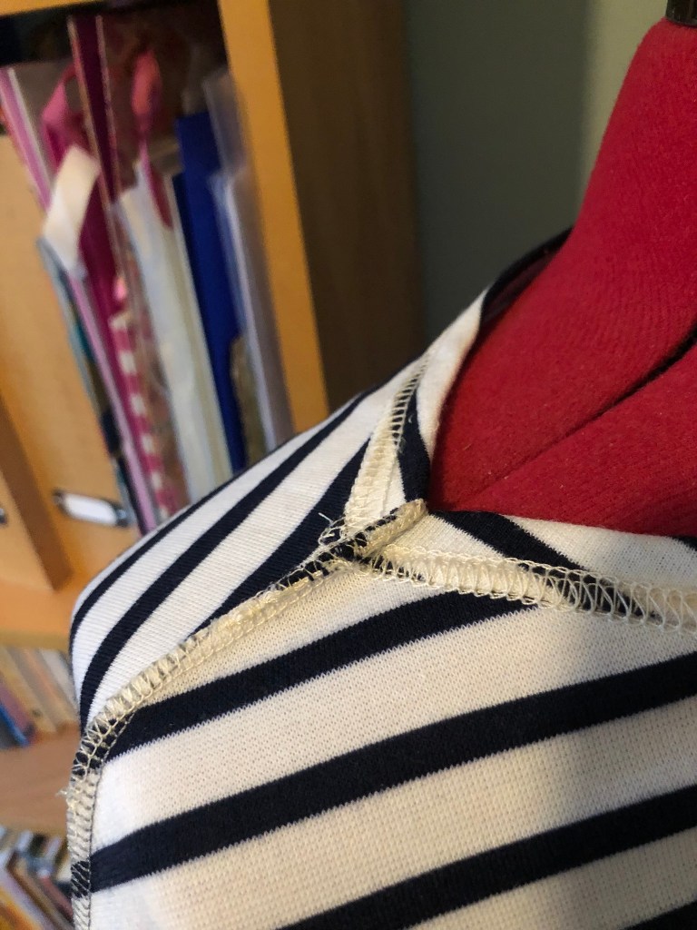 So I looked at one of my rtw’s, took the binding off, undid the shoulder seam a little, ironed on some iron-on stay-stitch tape close to the edge of the neckline to stabilise the neck, folded over about 1.5cm and cover stitched the neckline before sewing the shoulder seams back up. An alternative method perhaps but now looks flat and just what I was looking for.