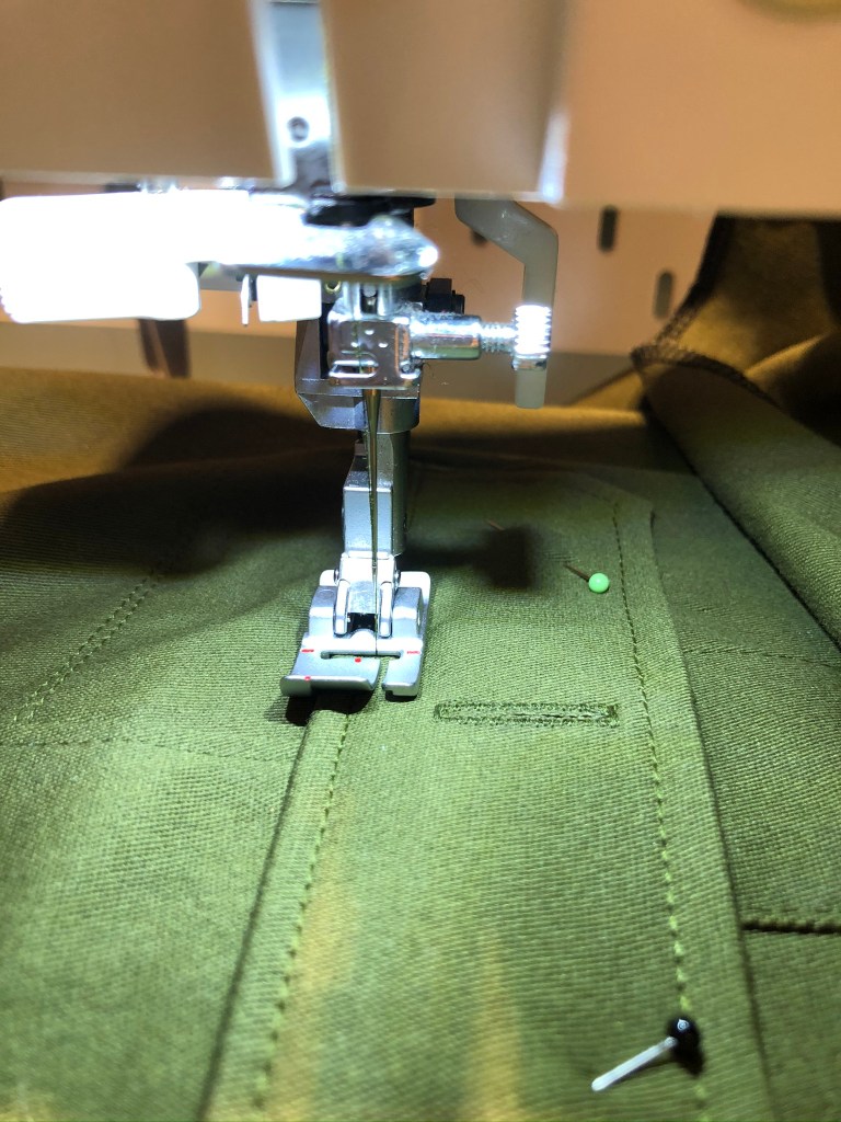 I used the same green thread as my top-stitching thread and am happy with the result. My edge foot (below) has been an absolute game changer in achieving neat top stitching.