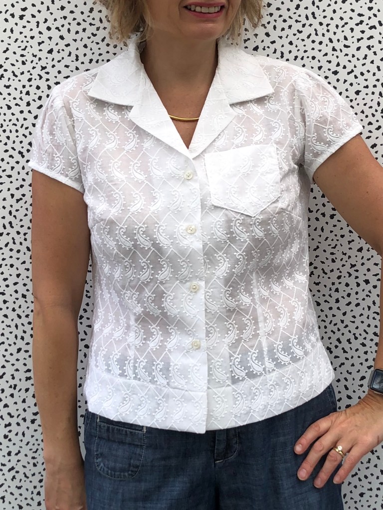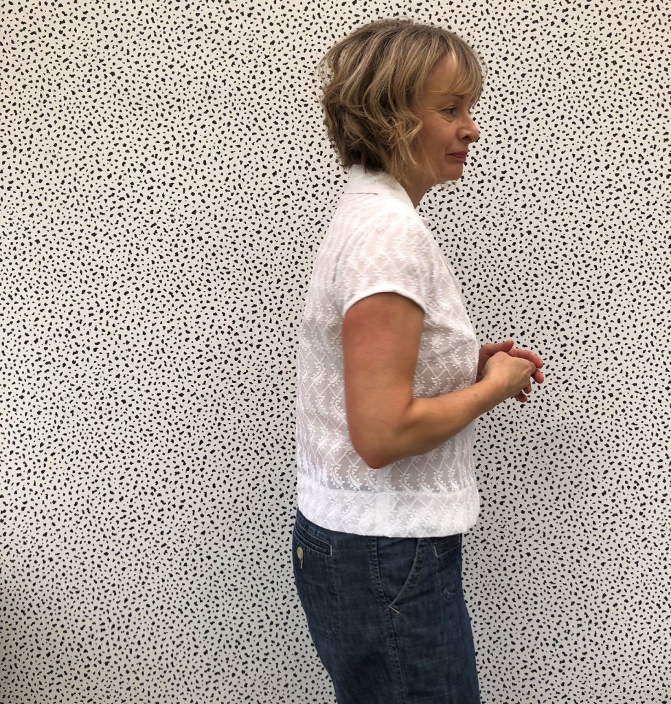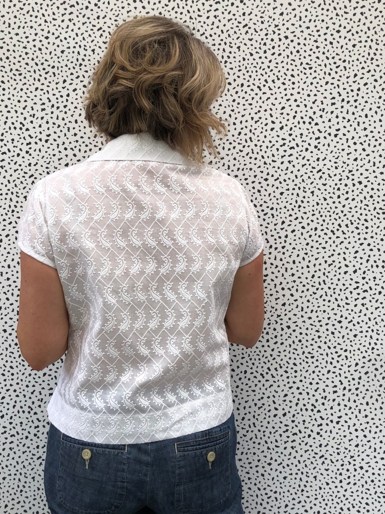 Of course the most obvious change is the length. When I first made up this blouse in this embroidered white cotton, I tried it on and it looked a little ‘meh’. Not the crisp white summer blouse I had in mind. It was too ‘pretty’ , but also stiff and not really me at all.