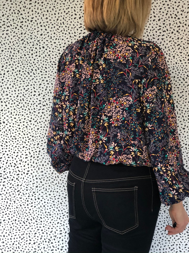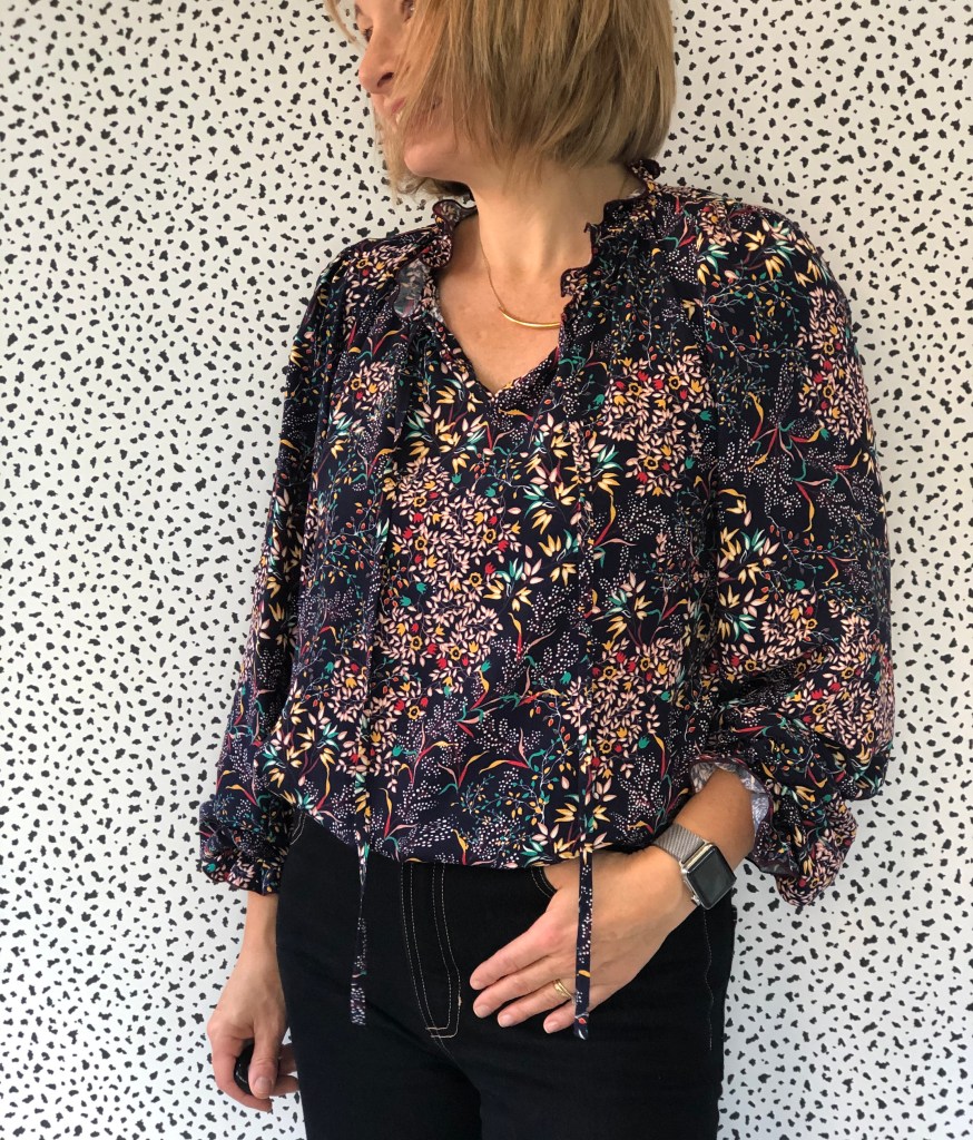 From the pattern description, ‘ Full of romance, the Freia Blouse is a gorgeously floaty lightweight top, with on-trend ruffles at the neckline and sleeve hems. The blouse gathers around the neckline into a pretty ruffle collar and is finished with a rouleau tie, while the set-in sleeves gather with elastic.’