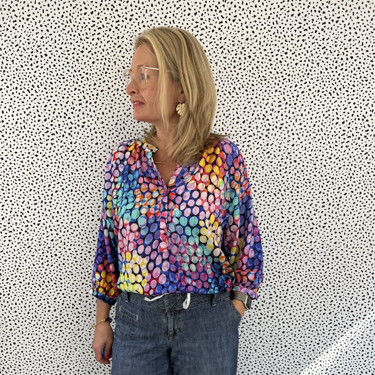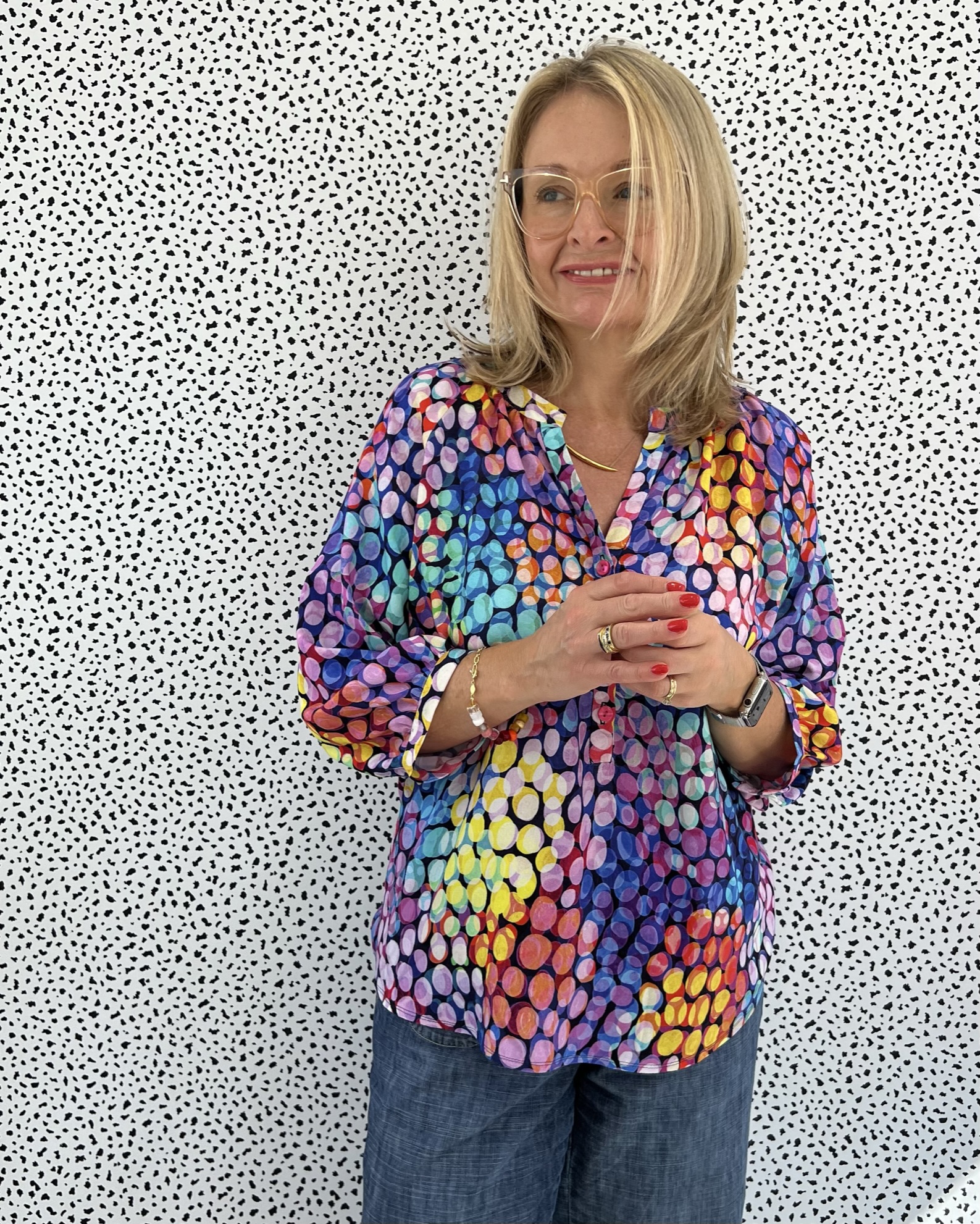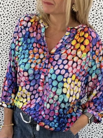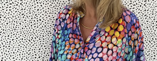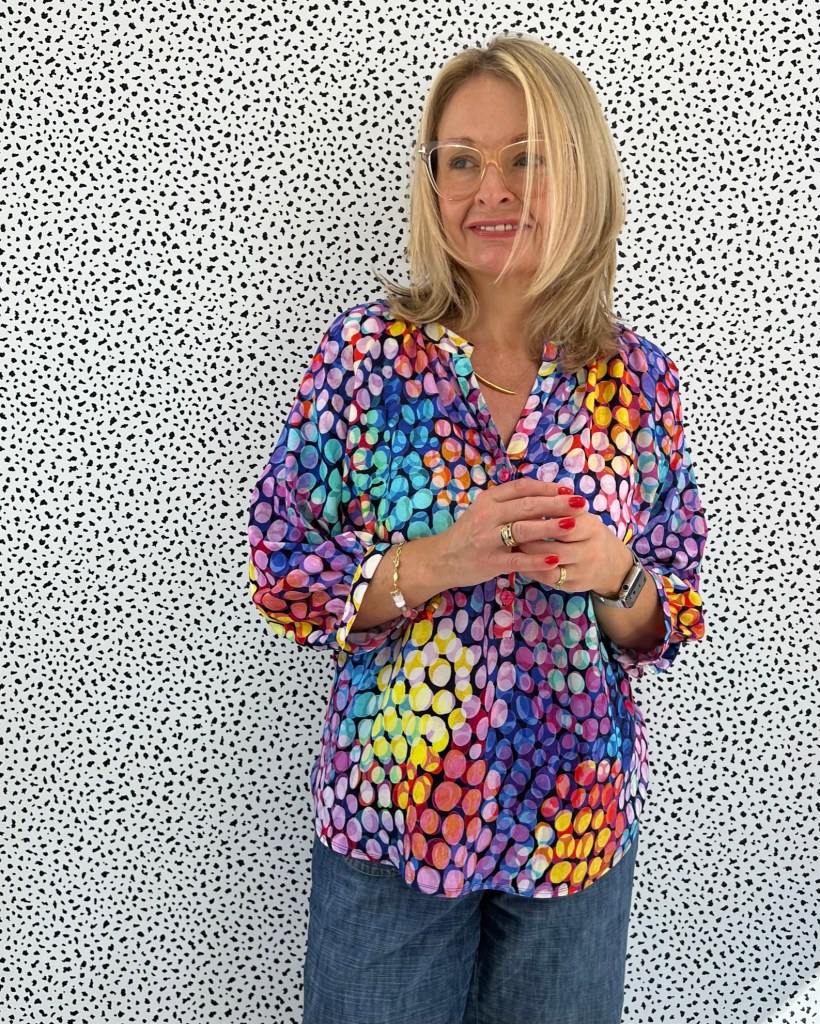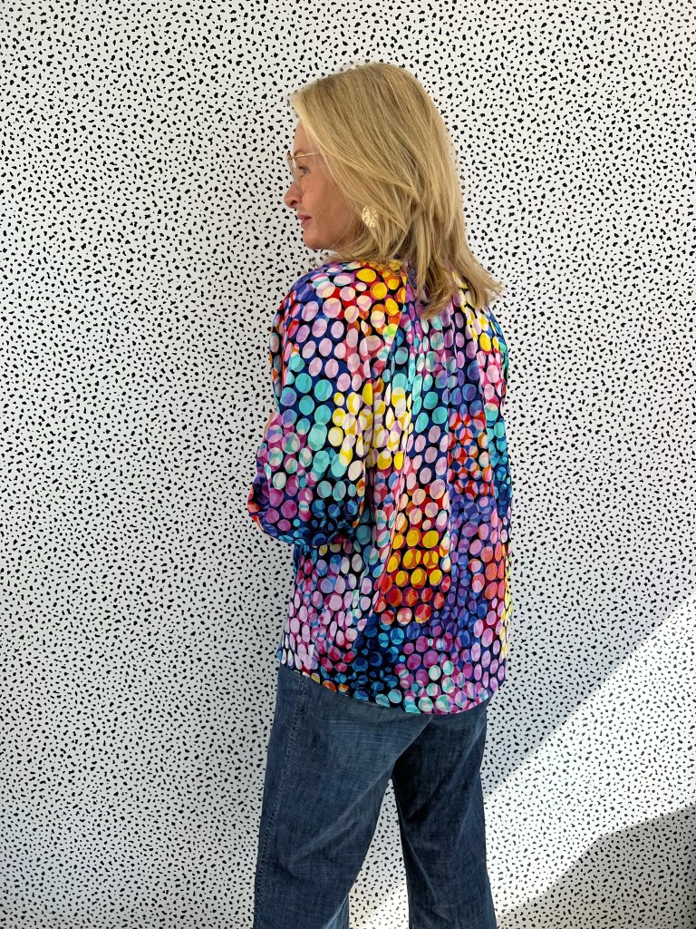 This is the beautiful Atelier Jupe Olivia Blouse (and Dress) in one of Minerva’s new exclusive viscose challis range that I was gifted from Minerva as part of my role as a Minerva Brand Ambassador. This one is called ‘Bubble Lights’.