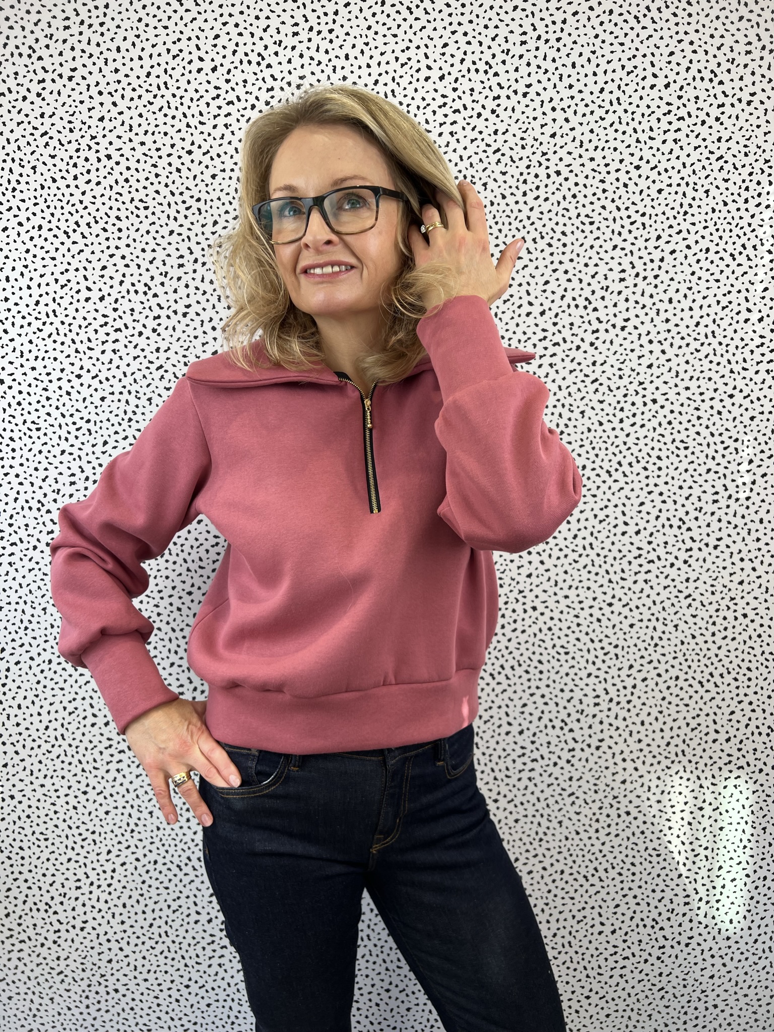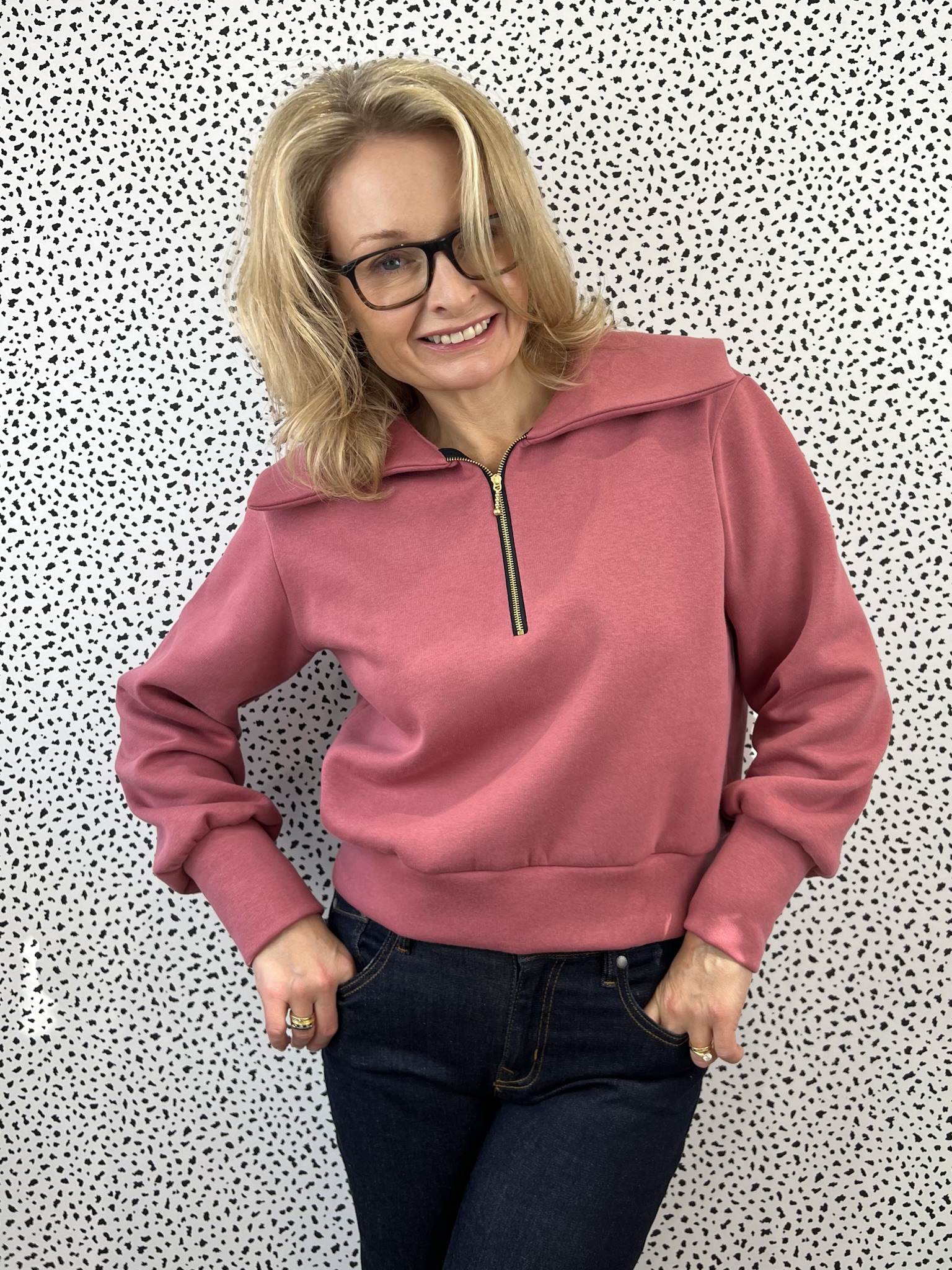 It’s a semi cropped half zip sweatshirt with an exaggerated collar and slightly dropped, slightly balloon sleeves and deep cuffs. The line drawing really appealed to me.
