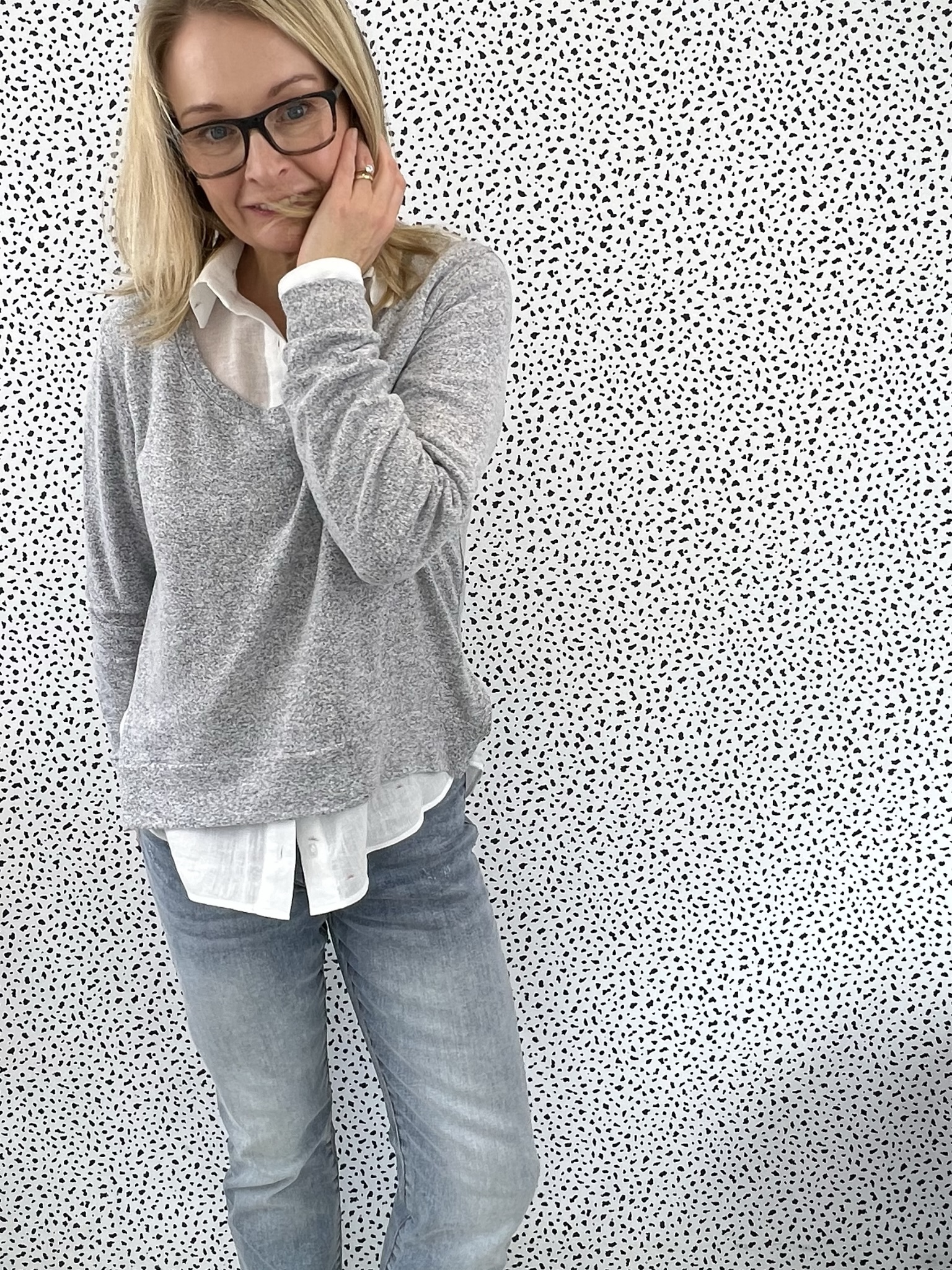 I love the shape of the neck line of the pullover to wear a with a shirt like this.