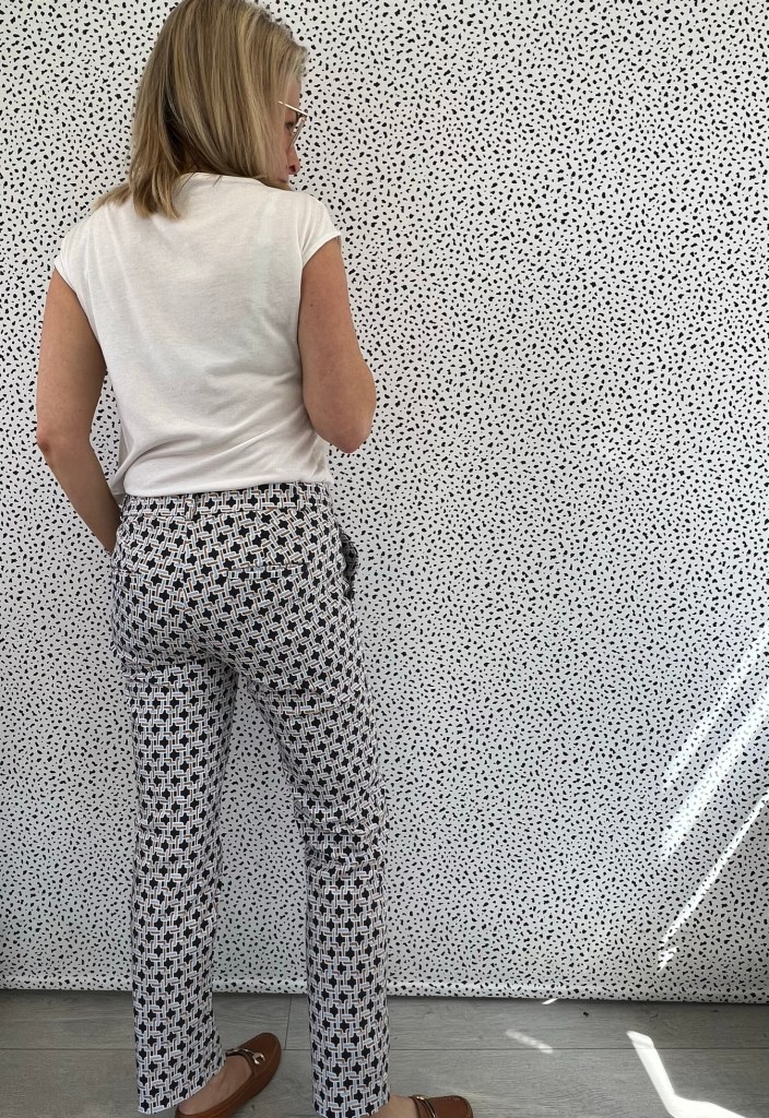 Due to the large stretch percentage I knew I was likely to need some further adjustment even after going down a size. But beware – there is little ease in these trousers as designed. 1 inch ease on the waist, 1 inch negative ease on the hip. The 5/8 inch seam allowance is helpful for adjustments.