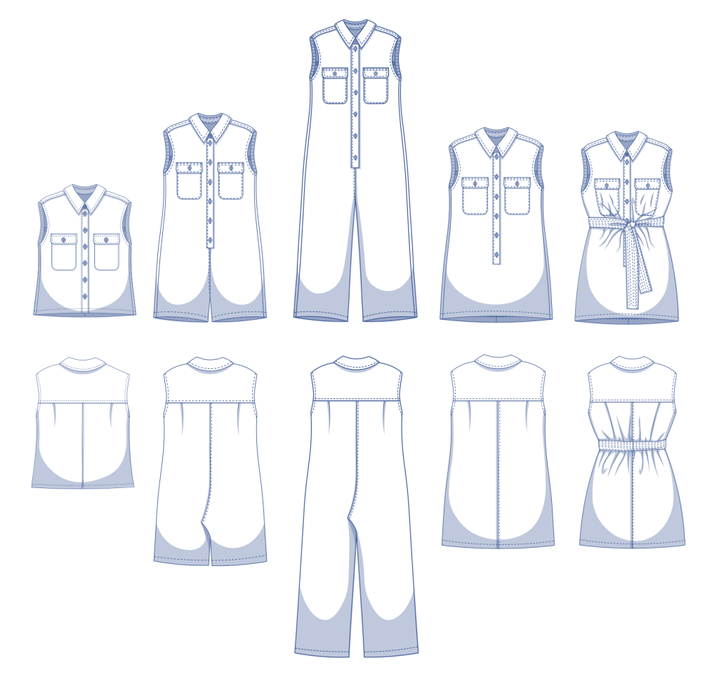 It comes as a sleeveless jumpsuit, collared playsuit, half placket dress, or a top; all with rounded chest pockets closed with a flap..