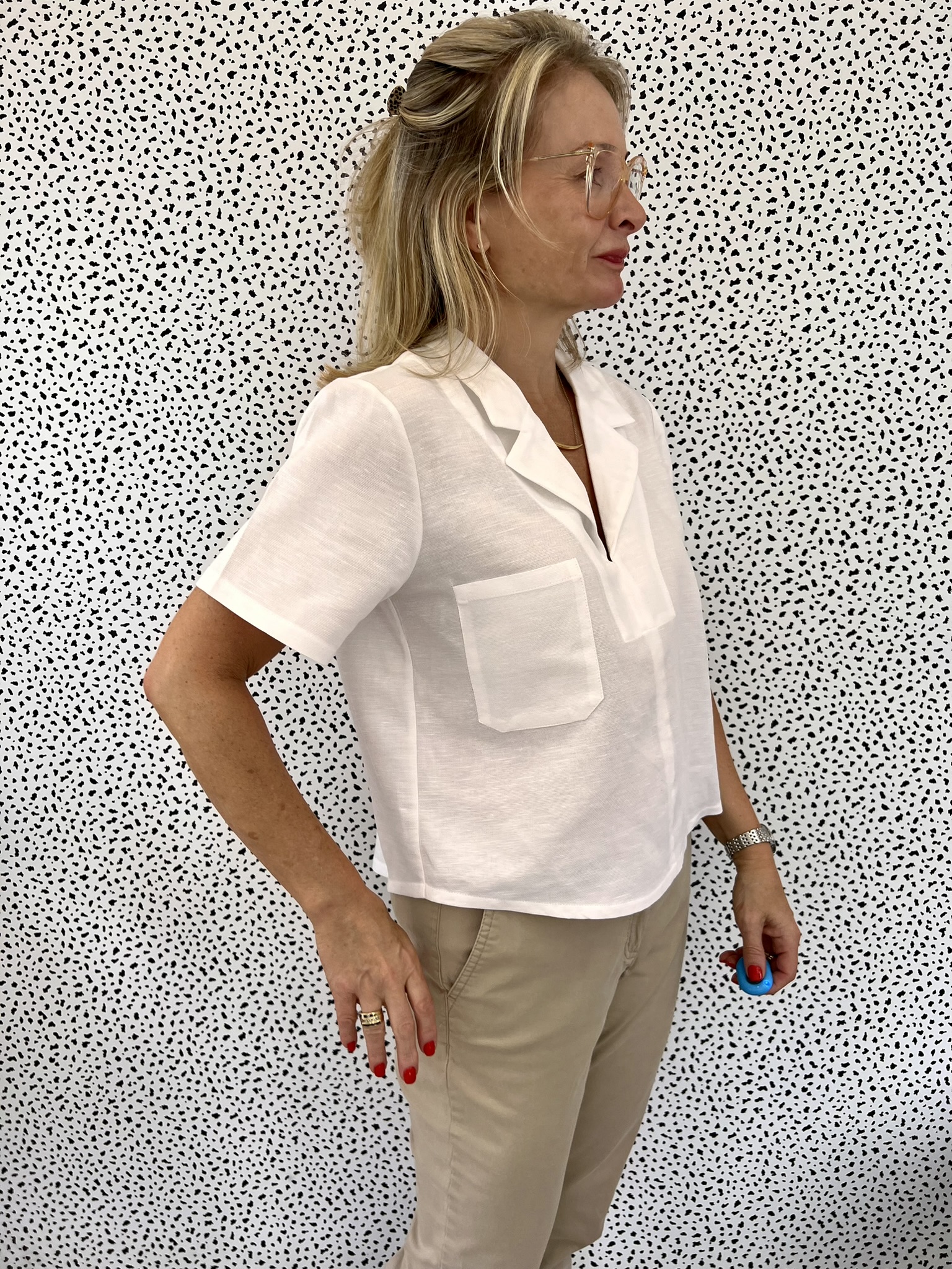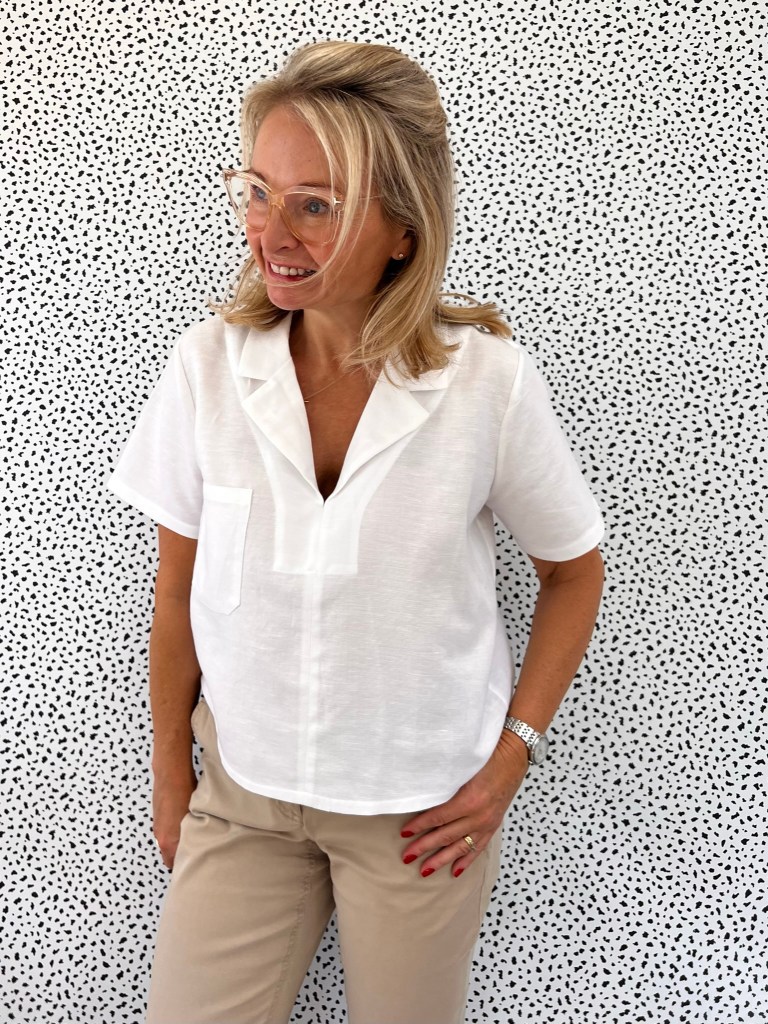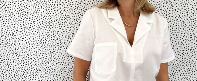 The Donny is described as a ‘boxy pull-on dartless top that has a lapel collar and patch pocket.‘